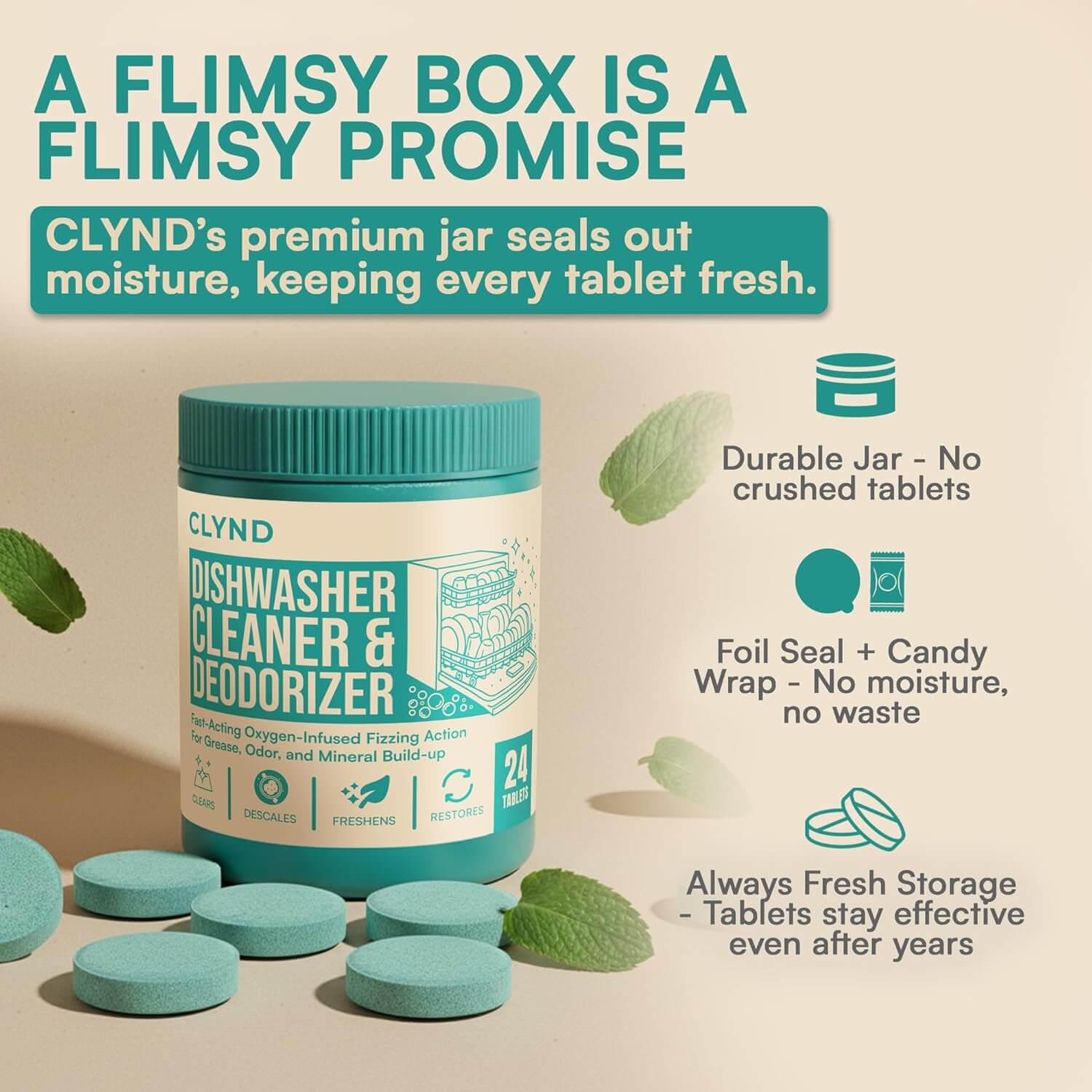 The CLYND Dishwasher Cleaner Tablets are excellent at removing odors. We use mint essence to neutralize trapped moisture smells and eliminate that "funky" dishwasher odor.