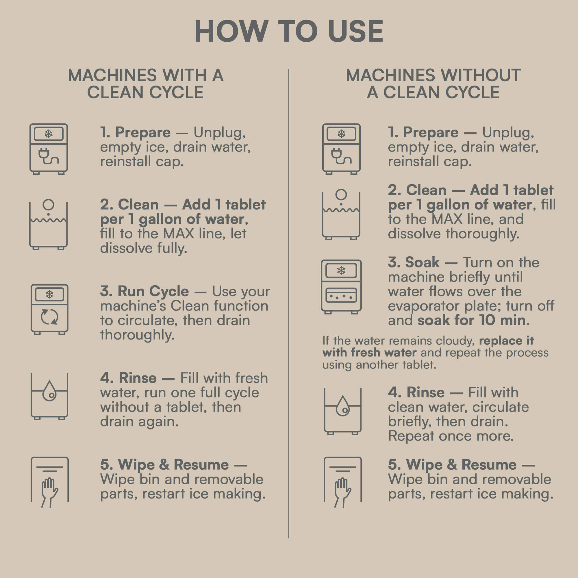 - For machines without a clean cycle: Run water over the evaporator, stop before freezing, let it soak for 10 minutes, repeat once, then drain and rinse with fresh water.