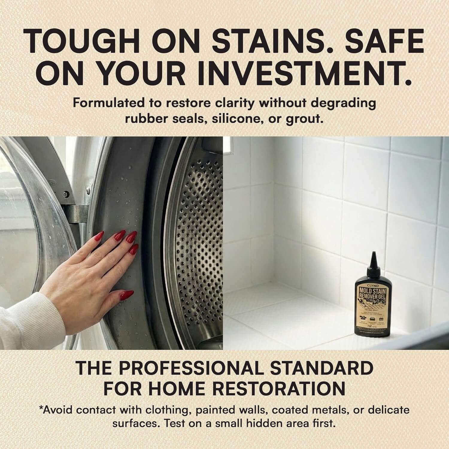 CLYND Mold Stain Remover Gel Cleaner is safe for tile, grout, silicone caulk, and rubber seals. However, we recommend avoiding use on wood, painted walls, or fabrics, as the concentrated formula may cause discoloration on these porous materials. Always test a small, inconspicuous area first if you are unsure.